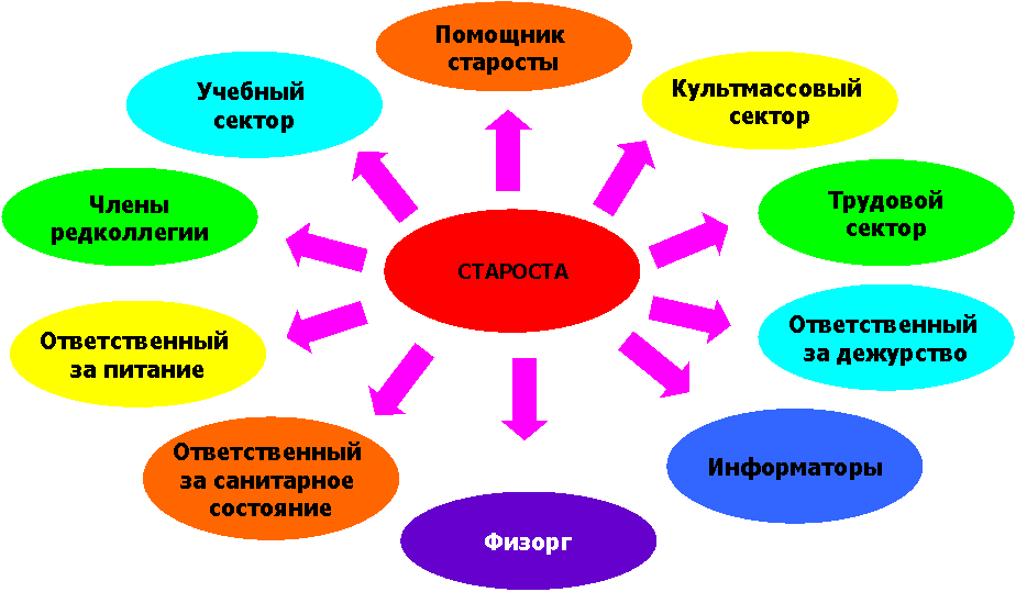 Во главе класса стоит орган ученического самоуправления – Совет класса, который возглавляет староста. Староста избирается собранием класса или по личной инициативе. В классе существует следующее распределение обязанностей: Староста осуществляет руководящую роль в организации и является уполномоченным по защите прав учащихся. Помощник старосты помогает старосте во всем, является ее правой рукой. Учебный сектор осуществляет контроль за учебным процессом в классе, организует проверку посещаемости и успеваемости по классам, помогает классному руководителю в подготовке и проведении интеллектуальных мероприятий. Ответственный за дежурство осуществляет контроль за дежурством в классе и в столовой. Культмассовый сектор осуществляет процесс подготовки и проведения внеклассных мероприятий, работает над составлением сценариев. Трудовой сектор осуществляет контроль за организацией субботников, санитарным состоянием классных кабинетов, озеленением школы и класса. Члены редколлегии осуществляют оформительскую деятельности, организует оформление гимназии к праздникам, конкурсы рисунков и плакатов,осуществляет сбор информации об интересных событиях в жизни школы и освещает ее . Физорг проводит мероприятия, направленные на реализацию программы «Здорового образа жизни» в классе и в школе.Осуществляет сбор информации о спортивной жизни , проводит спортивные мероприятия. Информаторы отвечают за сбор материалов для проведения информационных часов. Ответственный за санитаное состояние осуществляет контроль за чистотой класса, учащихся. Ответственный за питание следит за питанием учащихся. | ||||||